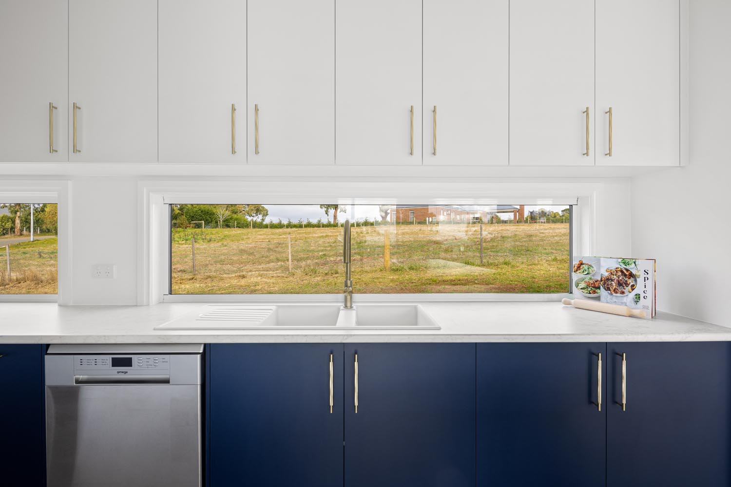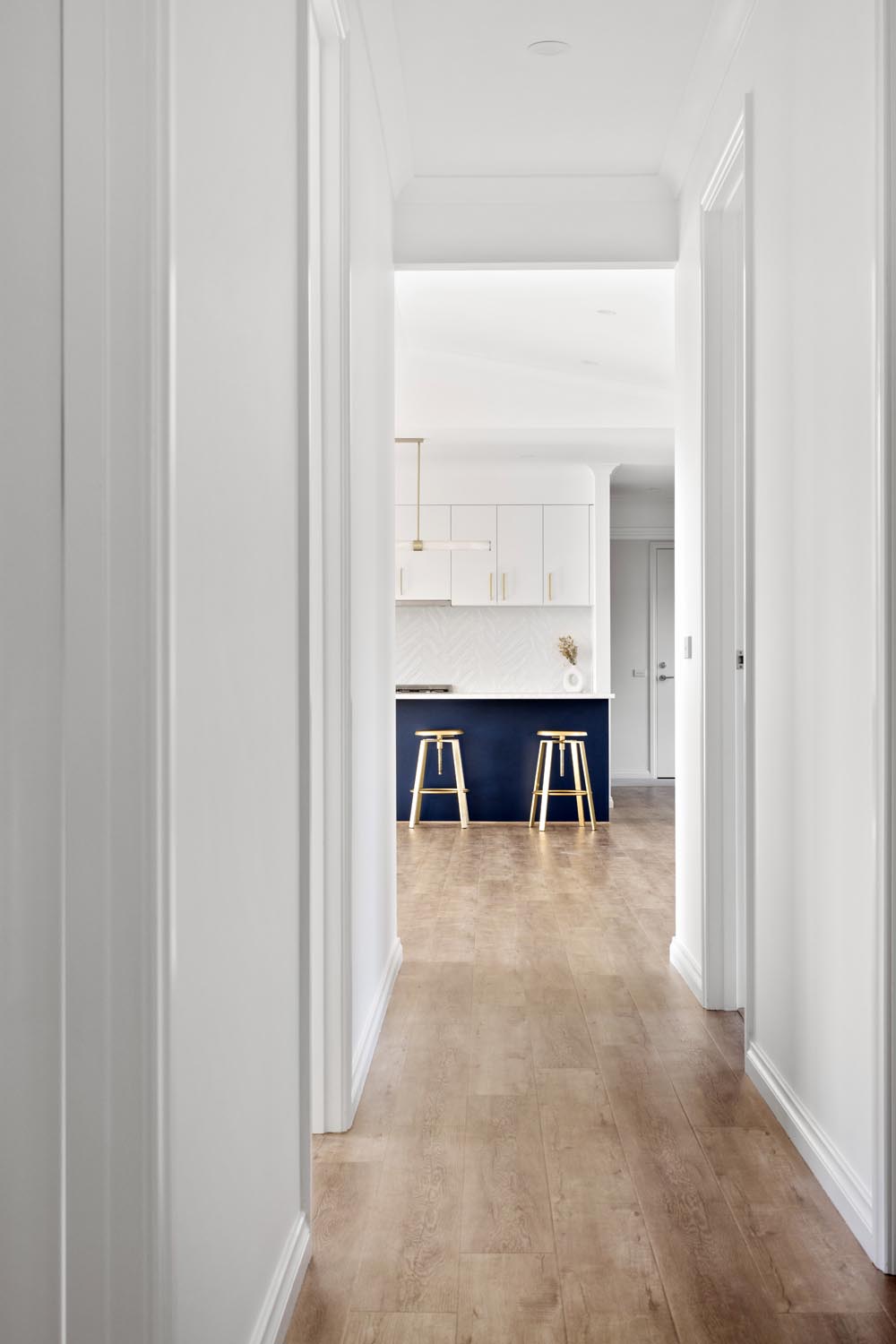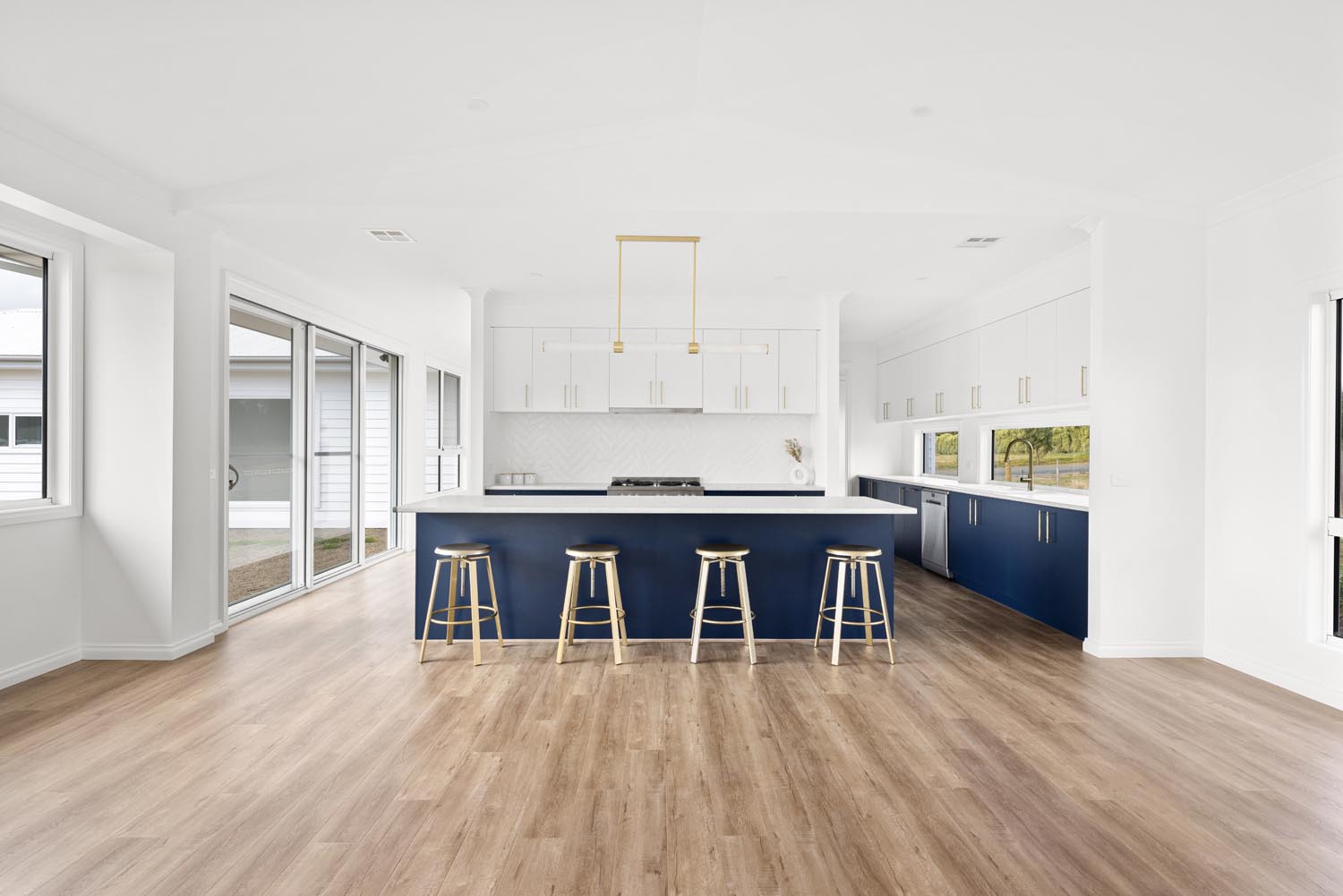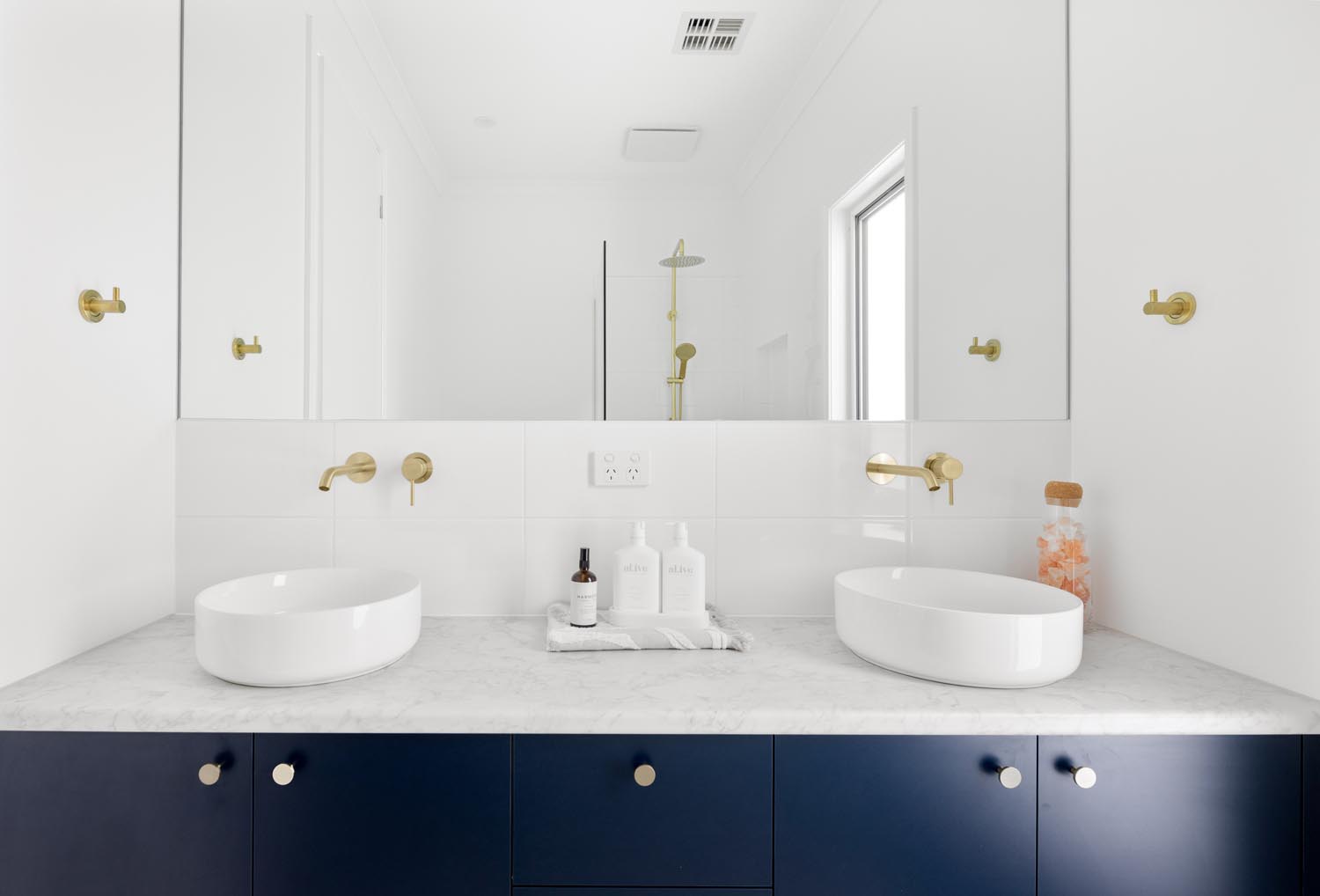 Kelly cleverly made the features of her home pop by creating a bright and neutral base pallet. In this light-filled home, the navy blue cabinetry and gold tapware becomes the hero against white walls and bleached timer flooring. Large windows capture the sunlight all day long and provide views to the yard from any room.