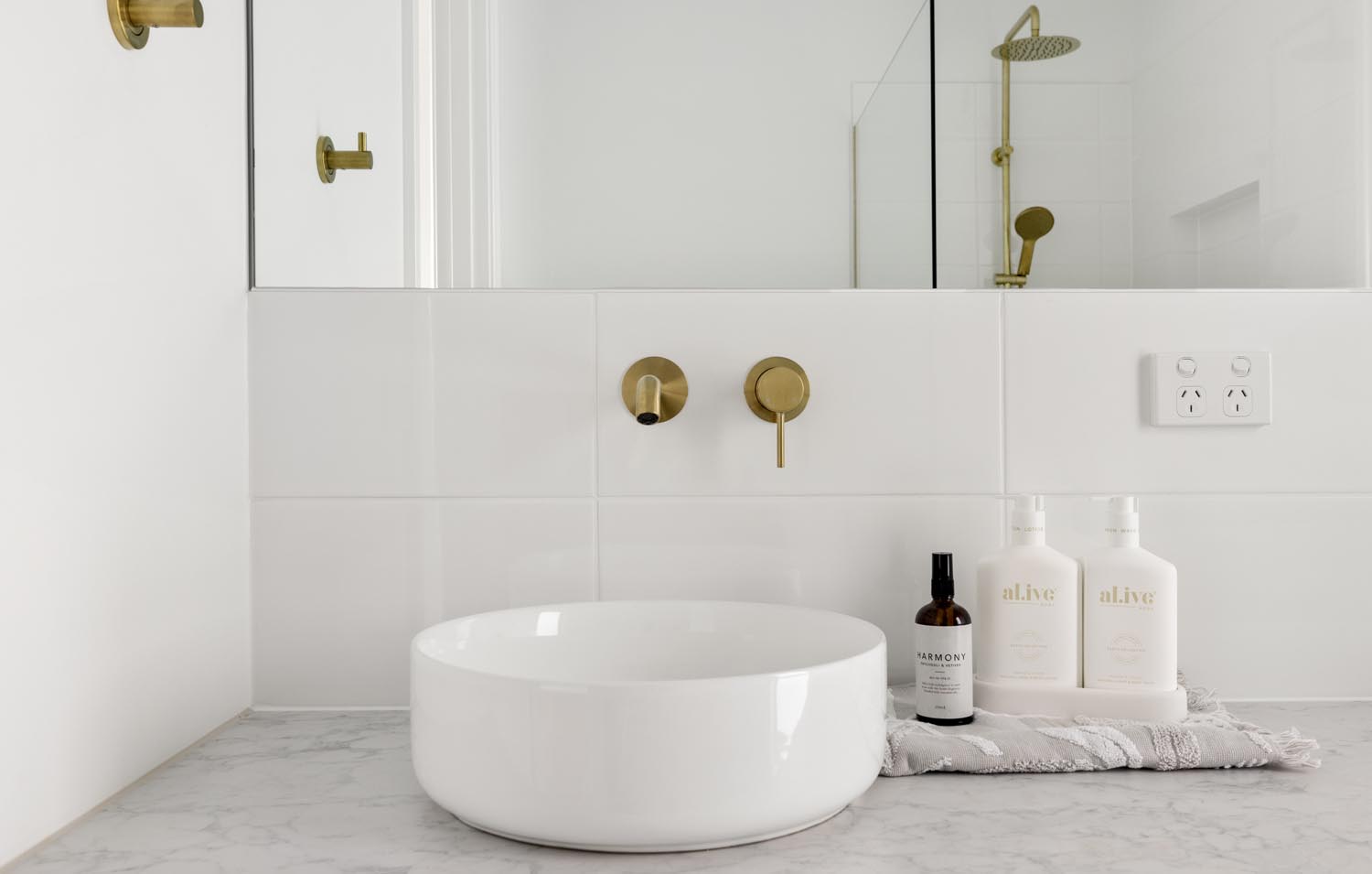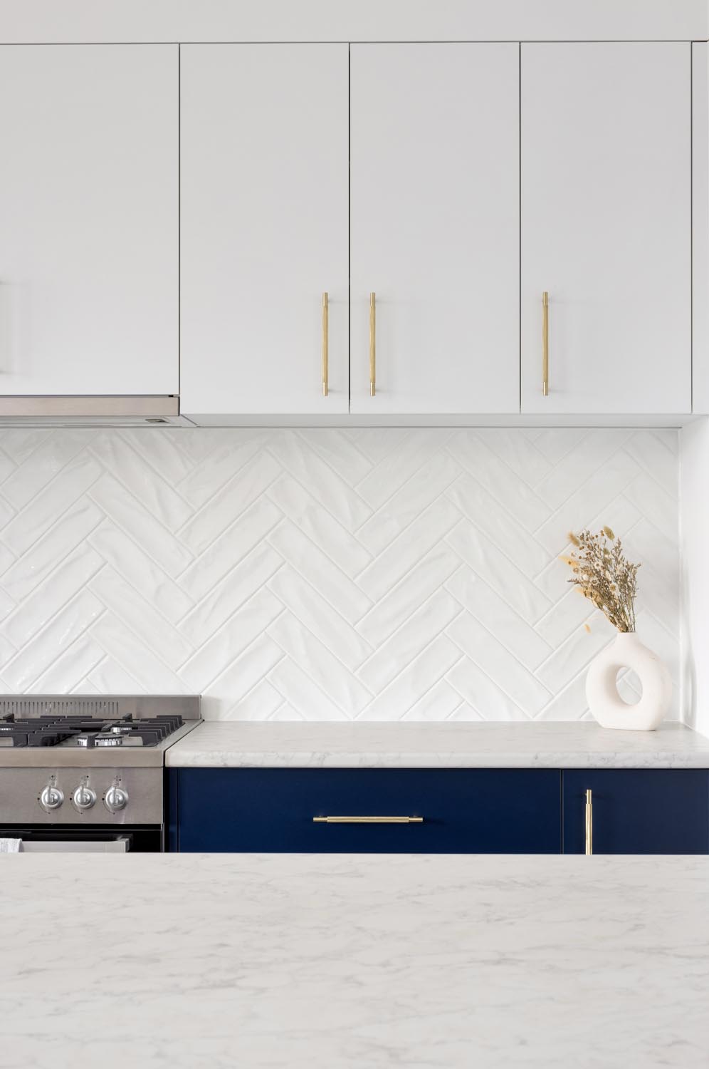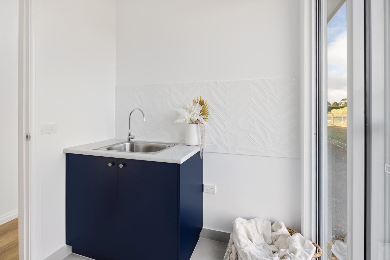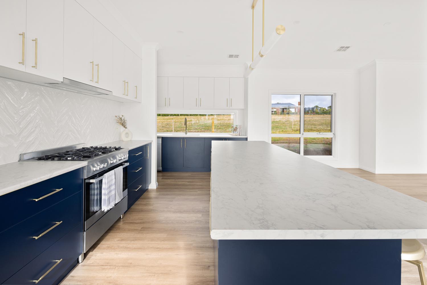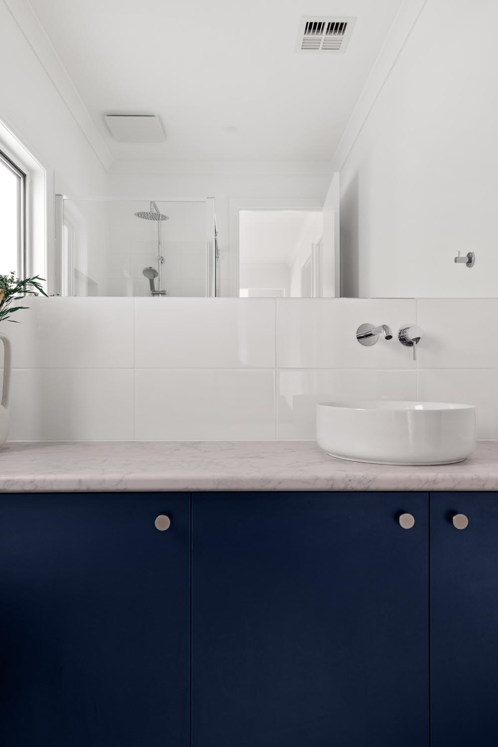 Kelly cleverly made the features of her home pop by creating a bright and neutral base pallet. In this light-filled home, the navy blue cabinetry and gold tapware becomes the hero against white walls and bleached timer flooring. Large windows capture the sunlight all day long and provide views to the yard from any room.