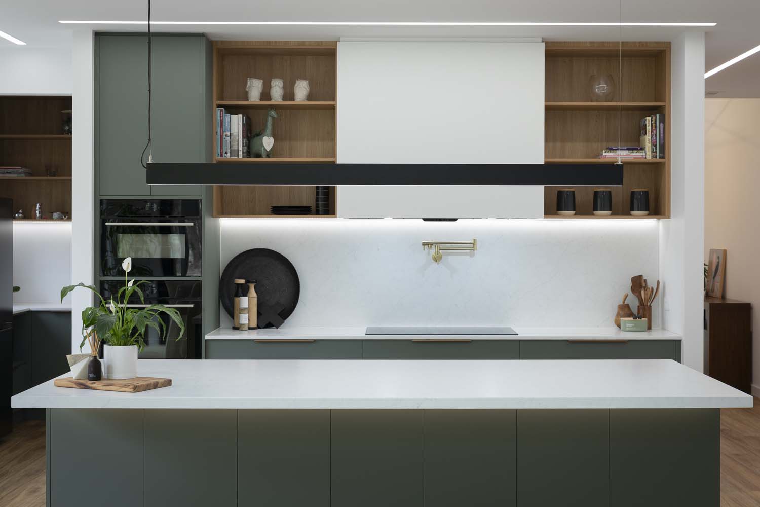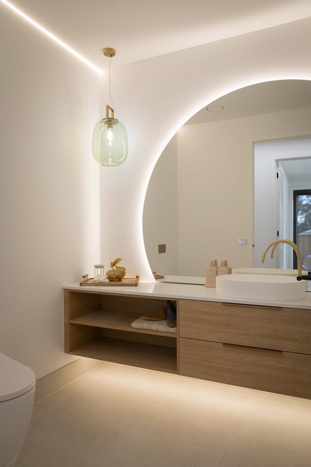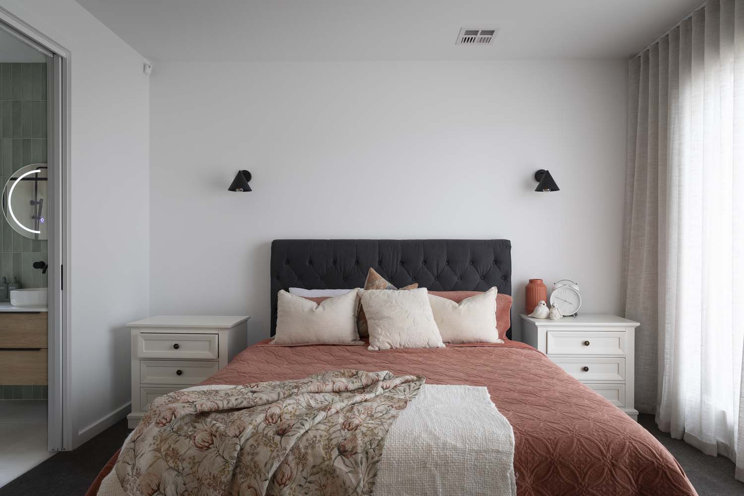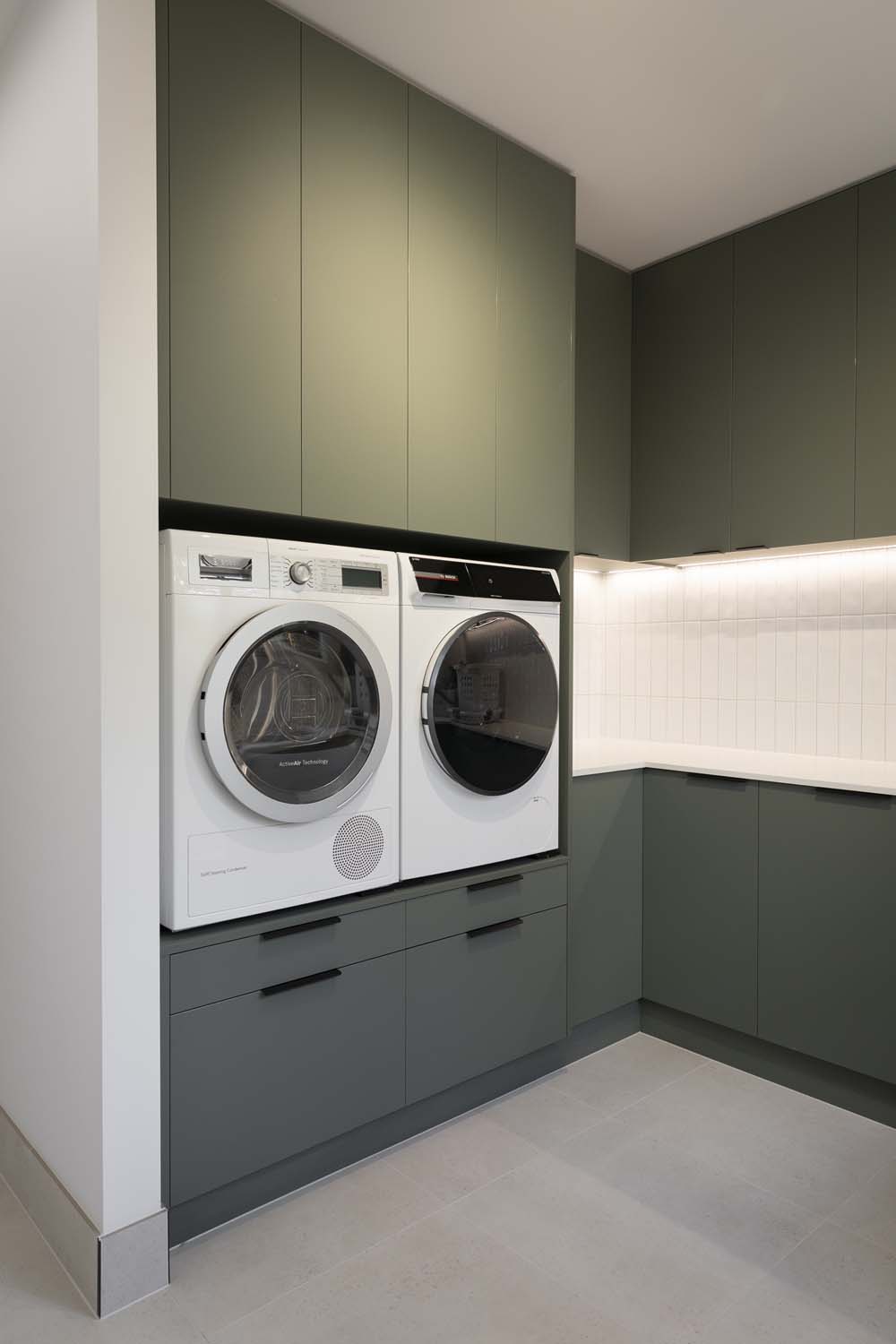 Material selections were made with longevity and elegance in mind. Neutral tones dominate the palette, ensuring the spaces remain fresh and contemporary for years to come, while the kitchen features a striking sage green—a nod to current trends and a touch of personality unique to this build. The master suite is positioned at the rear, overlooking a serene reserve, and offers seamless integration between bedroom and ensuite for privacy and practicality. The dedicated home office, complete with a temperature-controlled equipment storeroom, reflects a commitment to both productivity and aesthetic cohesion, making this residence a showcase of thoughtful, enduring design.