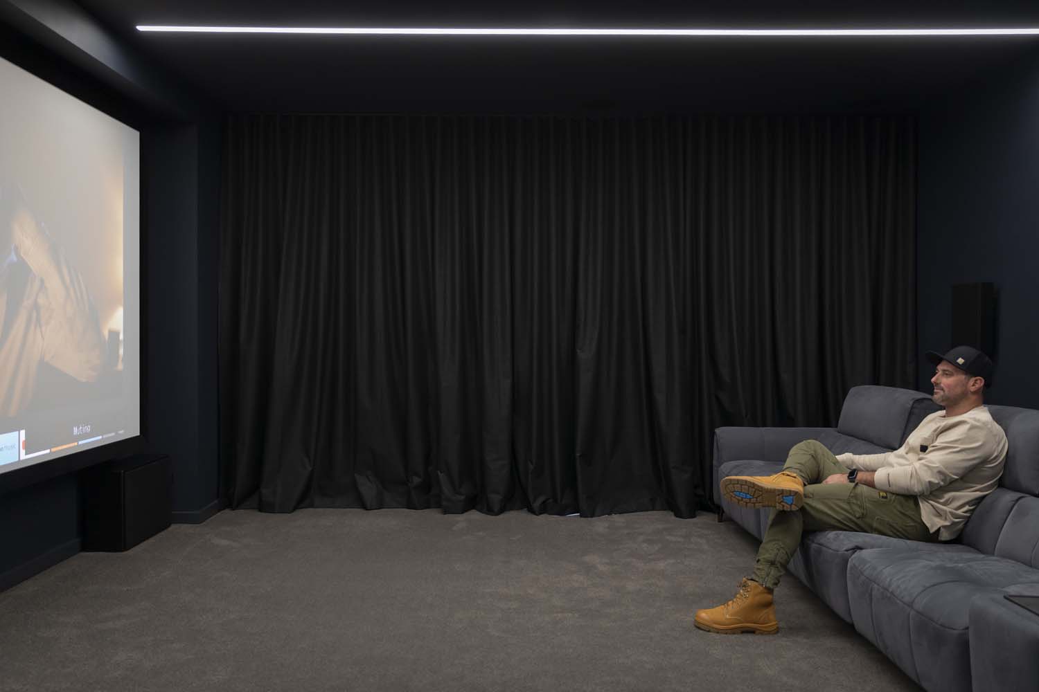 This thoughtfully designed home blends modern sophistication with timeless comfort, tailored for clients who value both functionality and style. The aesthetic is defined by an open, airy ambiance achieved through expansive rear windows and strategically placed skylights, flooding the interiors with natural light. The theatre room, equipped with custom Dolby Atmos speakers, offers a cinematic experience that rivals any commercial cinema, while the living area and guest suite are perfect for entertaining and accommodating guests without compromise. Throughout the home, recessed strip lighting and automated features—conceptualized and installed by the homeowner, an electrician—add a layer of subtle luxury and convenience.